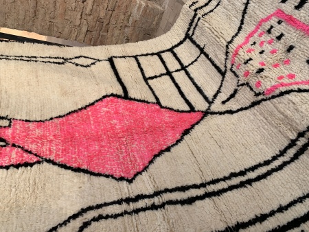 Contrairement au tapis berbère Beni Ouarain, des touches de couleur sont ajoutées à la composition à l’aide de bouts de laine teintée naturellement, de fils de cotons colorés ou parfois de tissus recyclés.